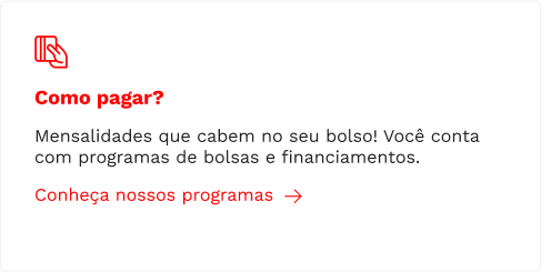 Faça a sua graduação acontecer! Aqui você conta com nossos programas de bolsas e financiamentos. Encontre o que melhor se encaixa no seu perfil.